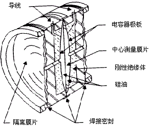被测介质的两种压力通入高、低两压力室,作用在δ元件(即敏感元件)的两隔离膜片上,通过隔离膜片和δ元件内的填充液传送到预张紧的测量膜片两侧。测量膜片与两侧绝缘体上的电极各组成一个电容器,在无压力通入或两侧压力均等时测量膜片处于中间位置,两侧两电容器的电容量相等。当两侧压力不一致时,致使测量膜片产生位移,其位移量和压力差成正比,故两侧电容量就不等,通过检测此电容极板上的差动电容,再由电子线路把差动电容转换放大成4-20mADC的二线制电流信号。